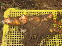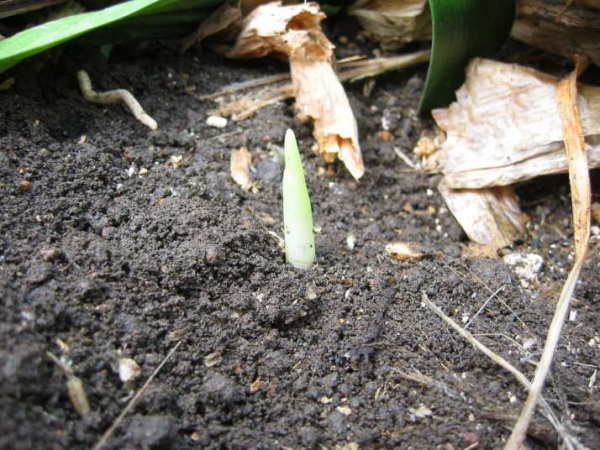 ハウス内であっても、芽が伸び始めるのは6月近い。これは球根植物のカラーと同じ。最初は白い芽が出て、日が当たり緑色になる。