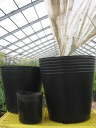 ポリポット各サイズ、左手前:5号(15cm)、右:9号(27cm)、参考価格:8号(24cm、写真左奥)で105円(単価)、購入先:園芸店、ホームセンター等。