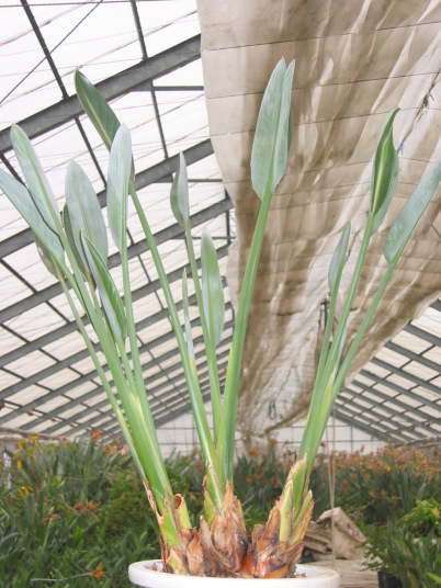 ストレリチアの栽培を始めて数年経つと、鉢が変形を始める。その後徐々に形が歪になり、例えば晩秋になって室内に取り込む際、鉢が割れていることに気が付く事がある。それが植え替え、株分けのきっかけとなる。この鉢はまだ割れておらず今後数年は栽培する事が出来るが、今回説明のために株分けを行った。