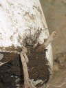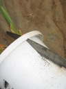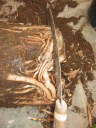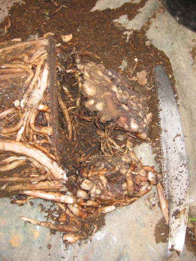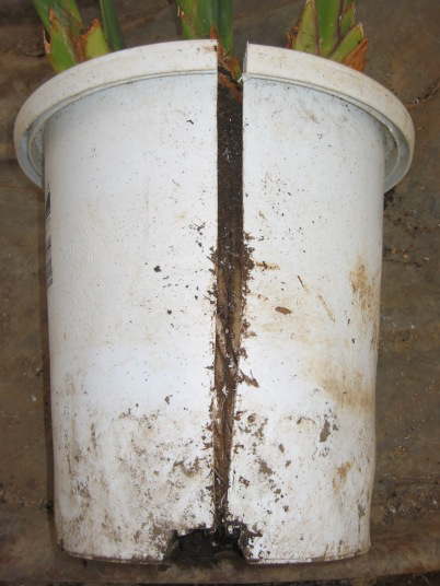 片側を下まで切ったところ。根が回っているため、自然に切り口が開いてしまう。この状態で抜けなければ、反対側も同様に切る。これで株を傷めない様に抜くことが出来る。