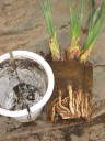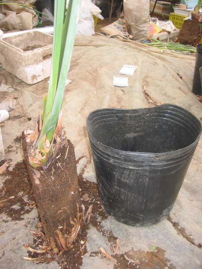 写真の場合、茎と根の境目を基準にしてみて高すぎる(浅植えになってしまう)ので、根鉢の下側をを切り詰める。