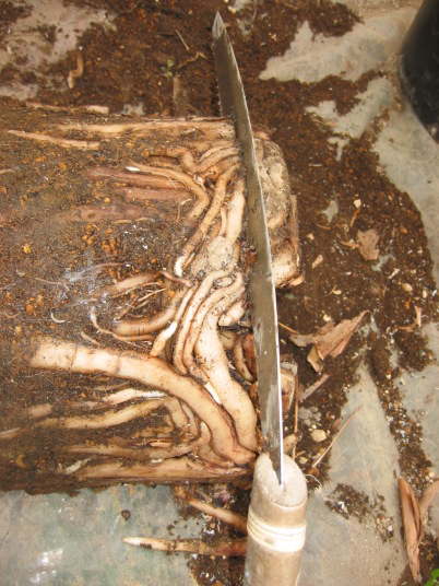 この状態ではまだ根鉢全体が大き過ぎるので、もう少し根鉢を切り詰める。ポットが変形しているのはそのせい。