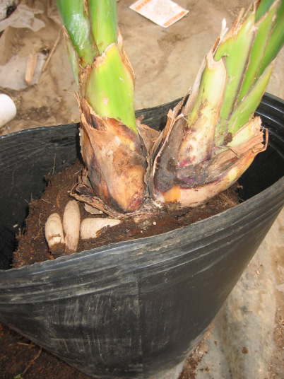 ご覧の様に白くて太い根が回っている。根は鉢の下半分に集中している。よって、ストレリチア栽培では高さのある長鉢(懸崖鉢等)が適する。