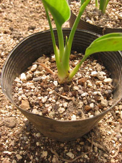 ※苗の植え替えで土を入れるとき、棒で突く必要は無い。また、植えるときは乾いた用土で植えれば良い。根は茎の下部から発生するため、浅植えの場合根の発生が少なくなり生育も悪くなる。