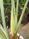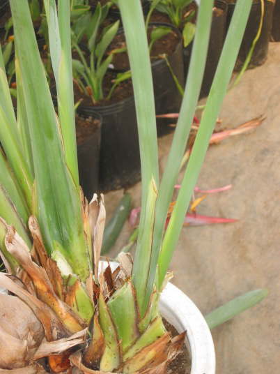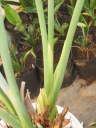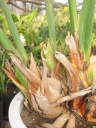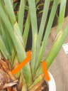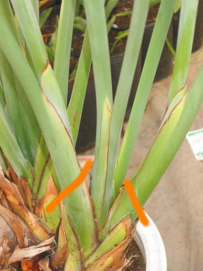 橙色線が切り取る位置を示す。この芽は葉が5枚付いていて、そのうち外側の葉に2本の花芽(花茎)が付いている。その花茎と葉を一緒に切り落とすとちょうど3枚残しになるが、それで問題無い。場合によっては、4枚残ることもある。地堀株から栽培を始めた場合、2枚しか残らないこともあるが問題無い。