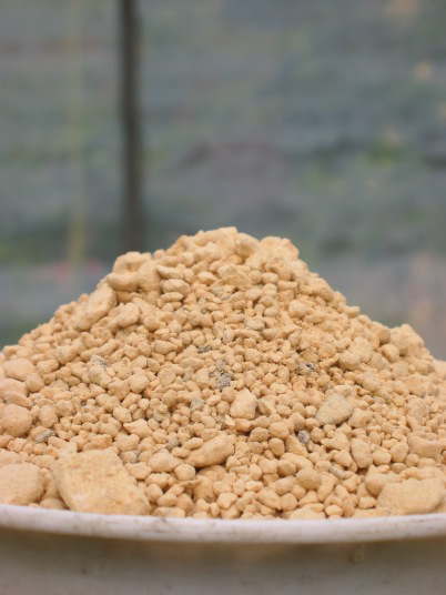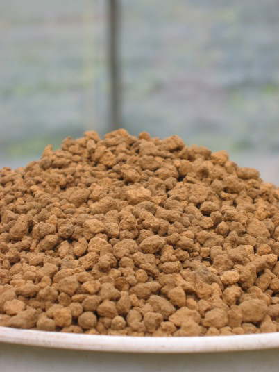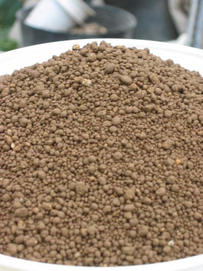 赤土粘質土を粒状にし高温処理したもの。水持ちと水はけが良い。無肥料のものと、肥料を添加したものがある。写真は無肥料のもの。粒状だが、これは一時的で、湿った状態で凍らせたり、時間の経過により粒が崩れる。一般の赤玉土は団粒構造で、こちらは単粒構造で異なる。同じ容積ならば、こちらの方が重い。