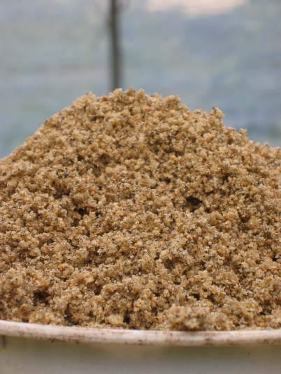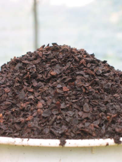 写真は主に穀物の皮をセルロース分解菌を含む微生物の力によって数ヶ月醗酵させた完熟堆肥の優良品。
