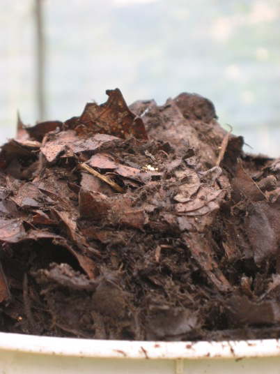 ケヤキ、クヌギ等の落葉広葉樹の落ち葉に水分、少量の窒素分を添加し腐熟させたもの。全体的に湿っていて、黒色で、組織がぼろぼろになっていれば問題無いと考える。