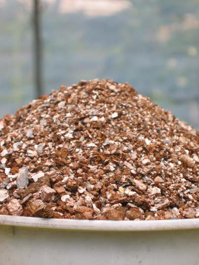 蛭石を高温で焼いて膨張させたもの。雲母の様に薄い層が幾重にも重なった状態。水持ち、水はけが良い。また、保肥力が大きい。