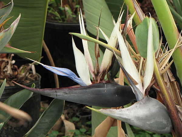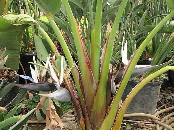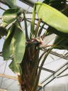(3)は千葉県内、とある道の駅ハウスに植えられた地植え中株。ニコライとしては草丈は5~6mと大きくないが、一般的なハウスではすぐに頭が閊えてしまう。それで葉が折れている。